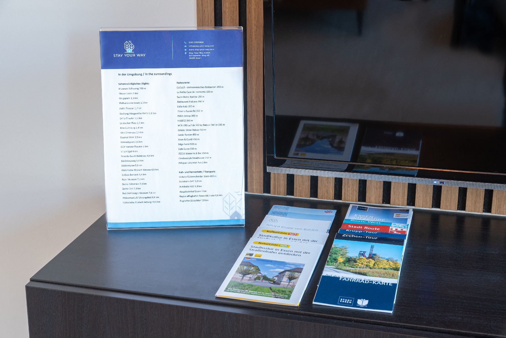 Quiet apartment for up to five people: two bedrooms, each with two single beds and a sofa bed, two desks, a fully equipped kitchen with two coffee machines (capsule and filter machine), a bathroom with a shower and bathtub, a washing machine, a PlayStation 4, located on the 2nd floor (no elevator), a garage in the backyard (entrance width approx. 2.32m, depth approx. 4.30m, for longer cars the garage door can simply be left open), additional parking options in the immediate vicinity, within walking distance to the trade fair Essen, surrounded by bakeries, cafés and restaurants.
