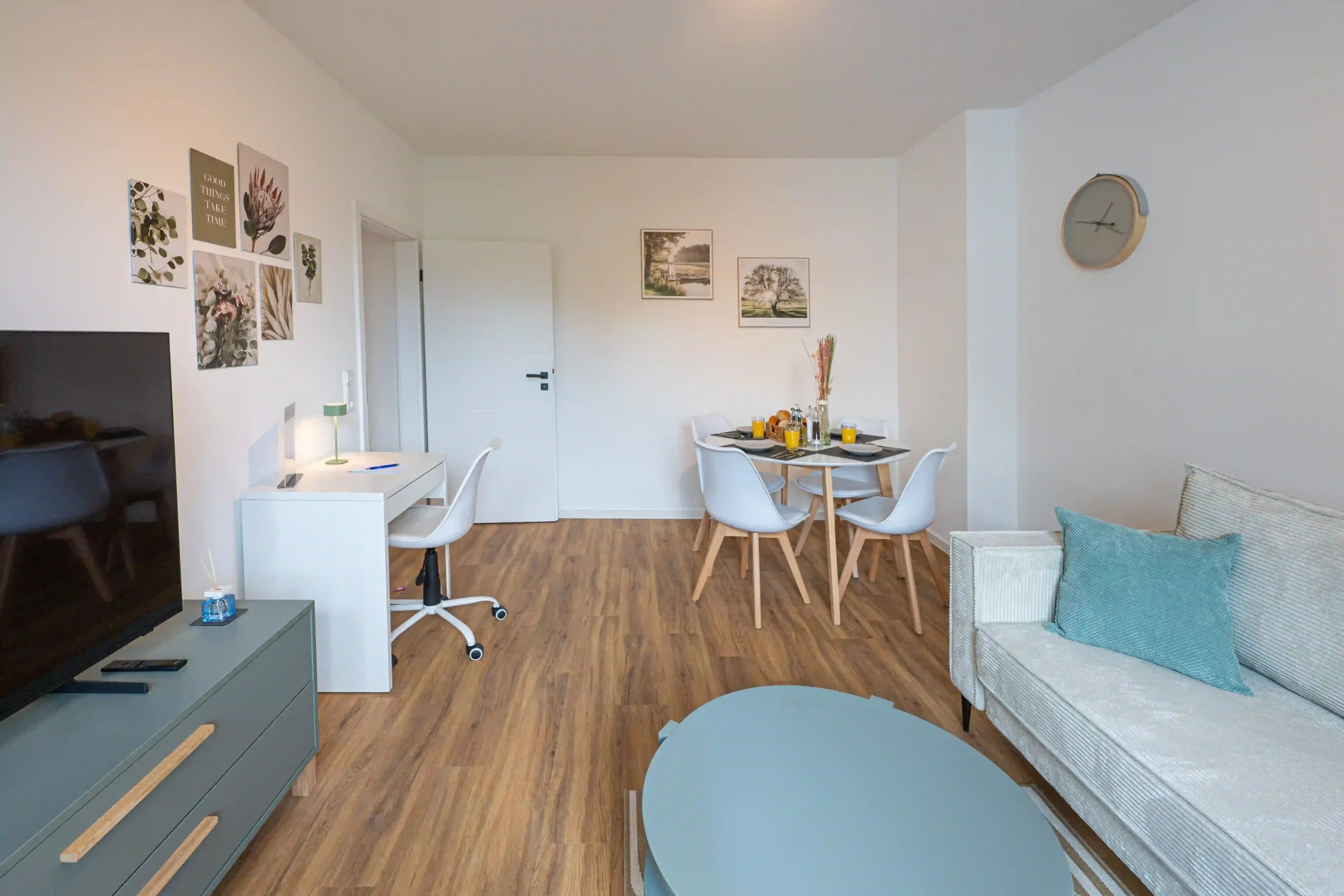 Das Apartment in der 2. Etage (ohne Aufzug) überzeugt durch ein Schlafzimmer mit einem hochwertigen 1,60 m breiten Doppel-Boxspringbett sowie eine sehr bequeme Schlafcouch im Wohnzimmer mit einer Liegefläche von 192 x 142 cm. Weitere Annehmlichkeiten sind die Fußbodenheizung, eine kontrollierte Be- und Entlüftungsanlage, ein Schreibtisch, ein 55-Zoll Smart-TV und WLAN. Haustiere auf Anfrage.